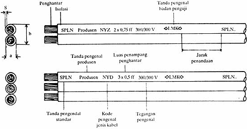 Penandaan kode pengenal dilengkapi dengan luas penampang penghantar dan tegangan pengenal. |