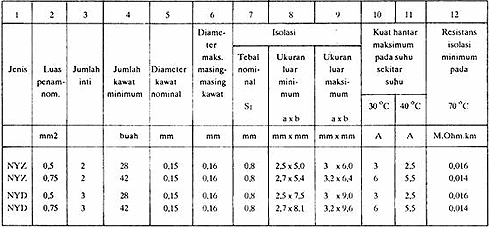 Nilai arus yang tercantum dalam Tabel I kolom 10 dan 11 berlaku untuk kawat-kawat fleksibel kembar 2 dan 3 berisolasi PVC di dalam ruangan |